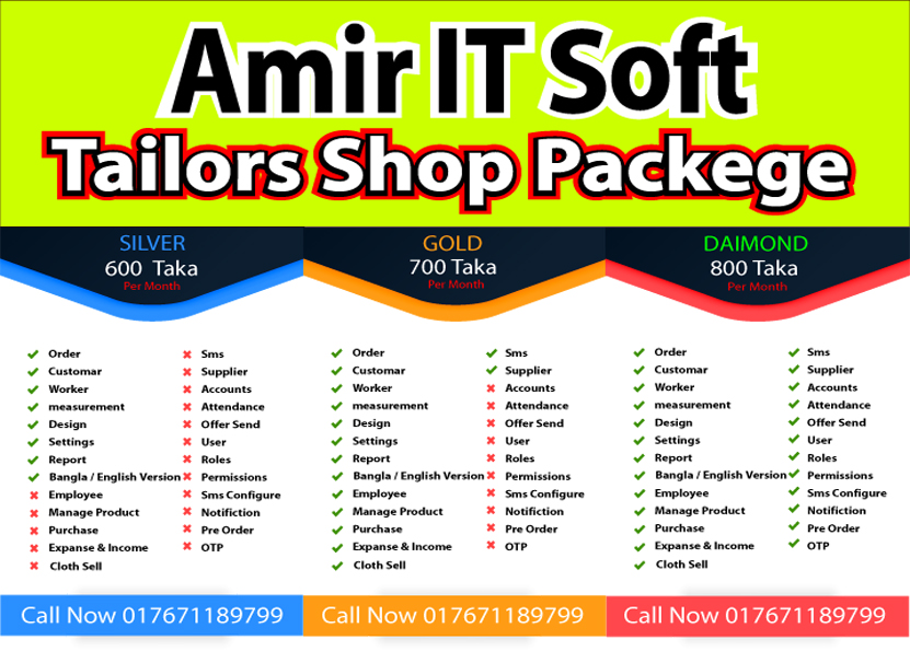 আপনি যদি আমাদের টেইলারিং সফটওয়্যার যে সমস্ত প্যাকেজগুলো আছে তার ভিতর থেকে কোন প্যাকেজ ক্রয় করেন। তাহলে আপনি আমাদের সফটওয়্যার সকল সুবিধাগুলো উপভোগ করতে পারবেন।